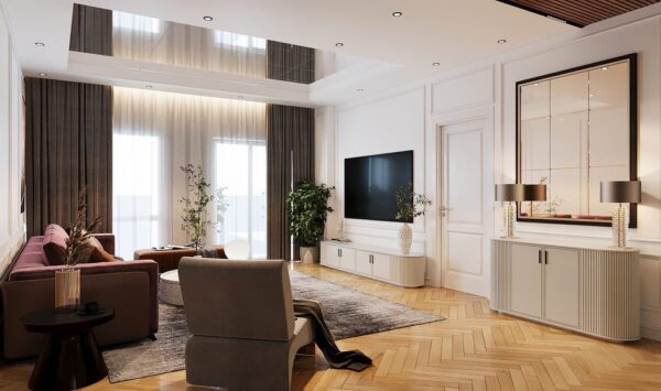 Phong cách thiết kế: Modern Luxury – sử dụng đá cao cấp, kính phản quang, ánh sáng tự nhiên