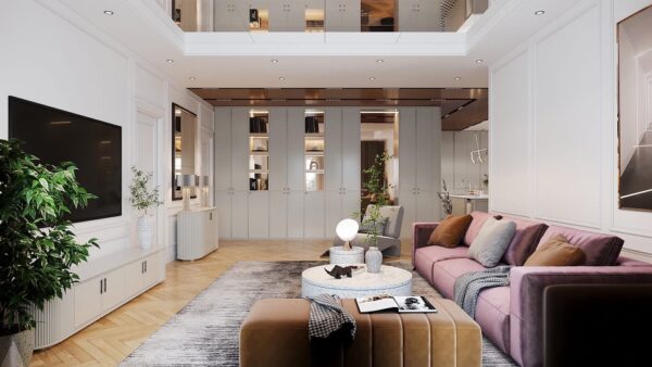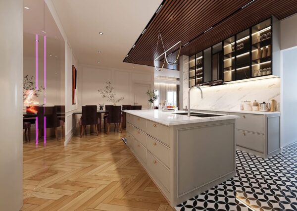 - Phòng khách và bếp lệch tầng nhẹ, giúp dòng khí chuyển động ổn định, tụ tài – không lo tản khí