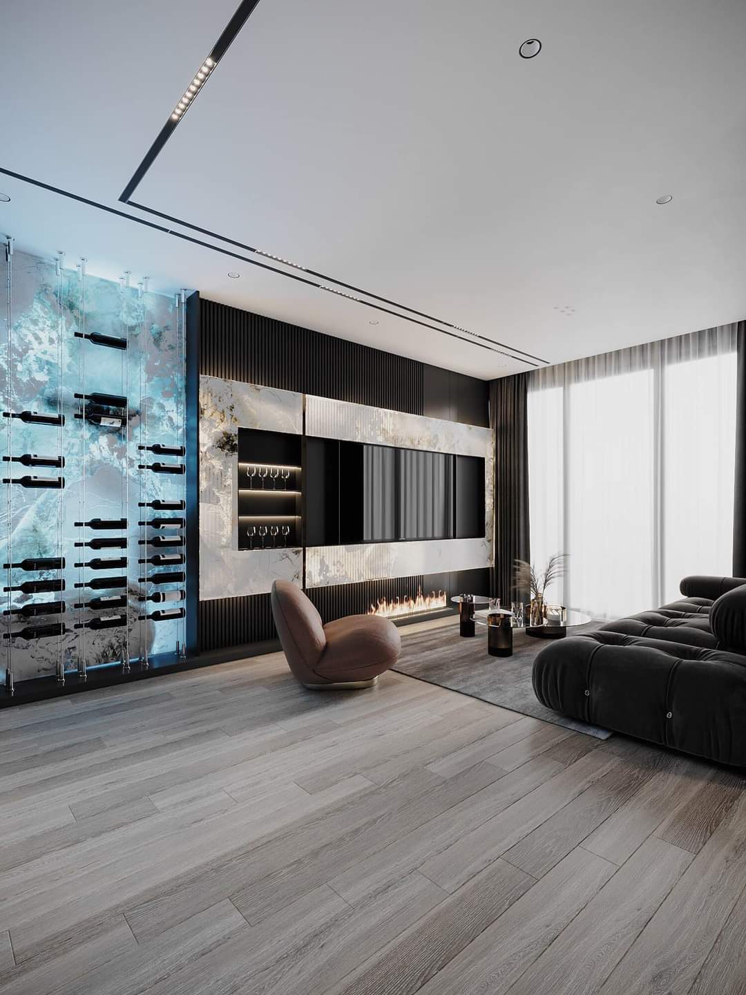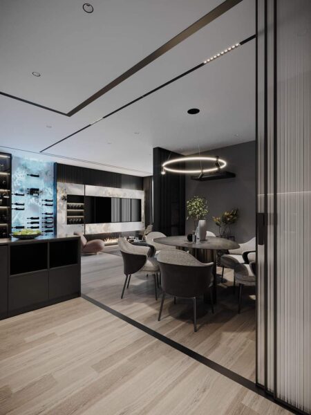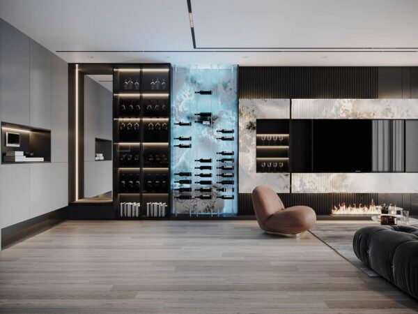 - Vật liệu chính: Gỗ óc chó, đá nhập khẩu, kính phản quang