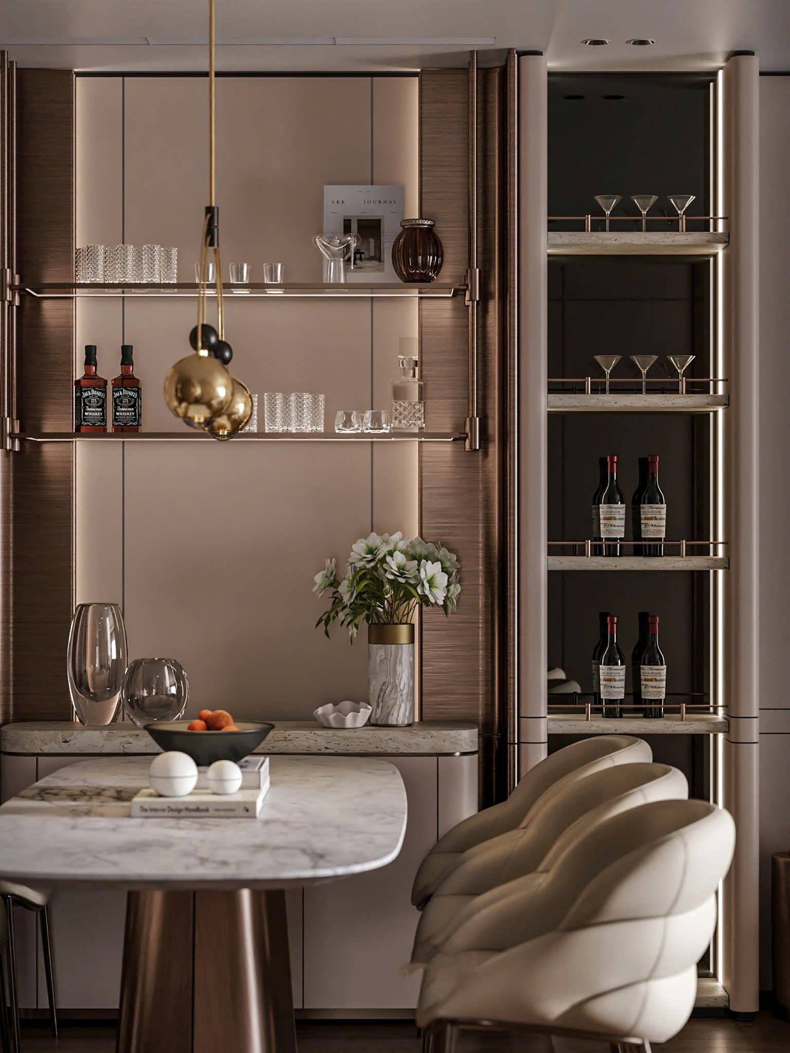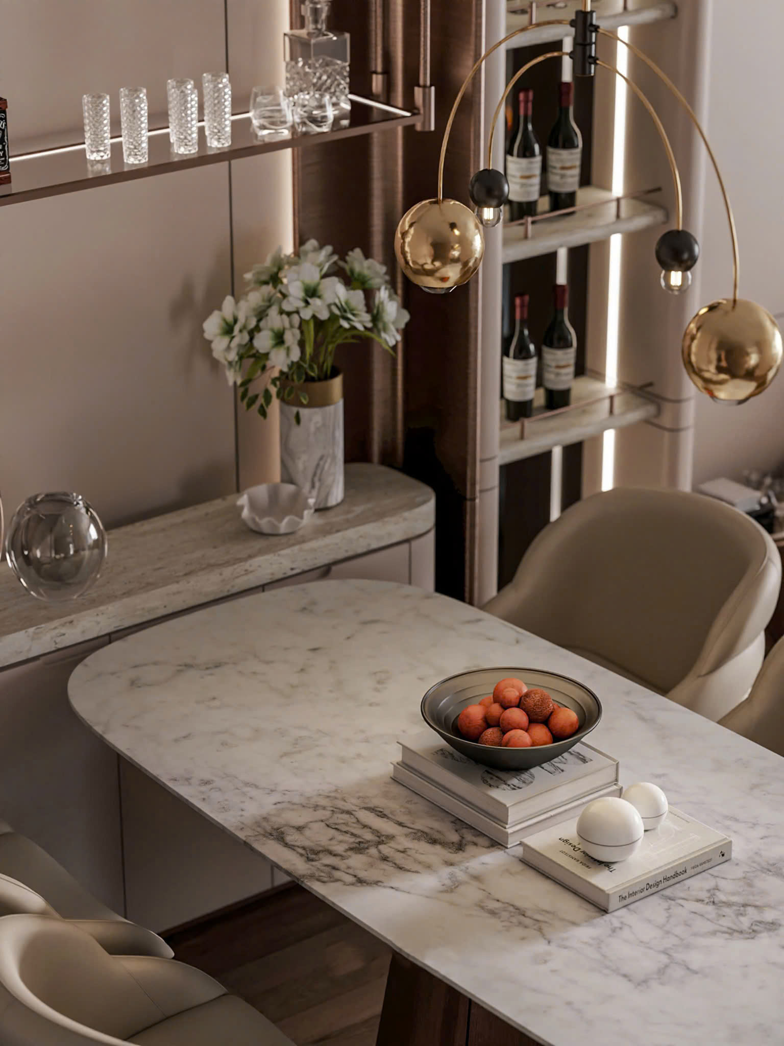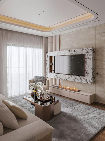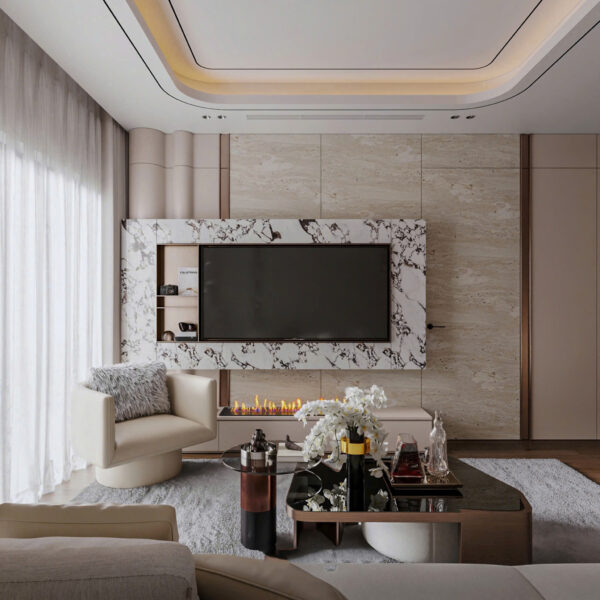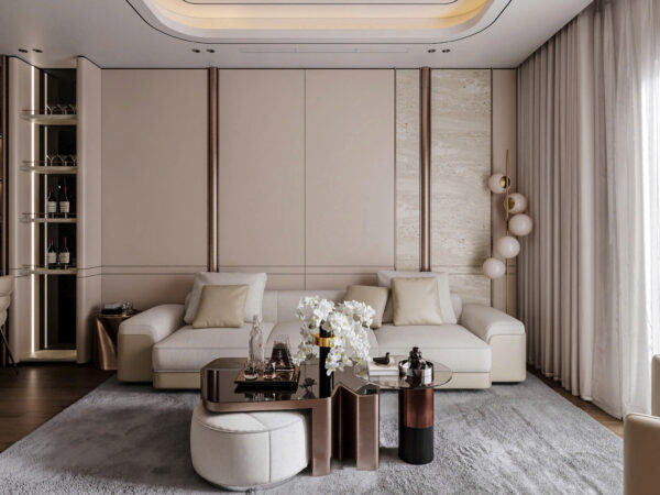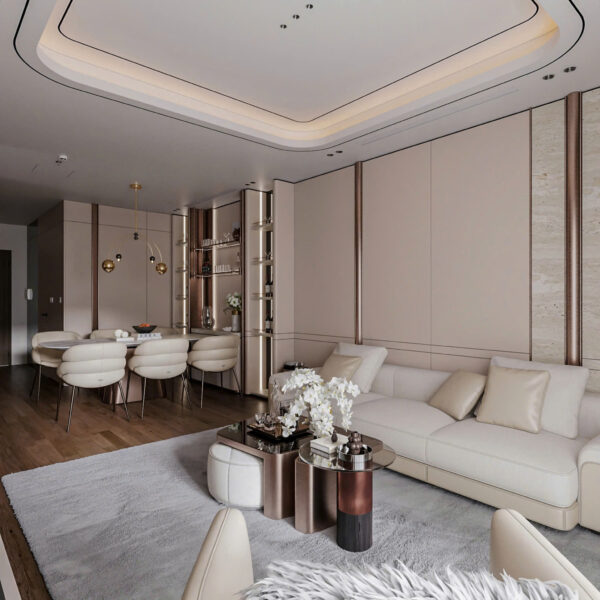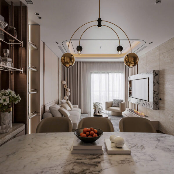 Phong cách thiết kế: Hiện đại Luxury – tông màu trắng kem, be vàng, ánh đồng kết hợp chất liệu đá và kim loại mạ vàng, mang lại sự sang trọng và ấm cúng