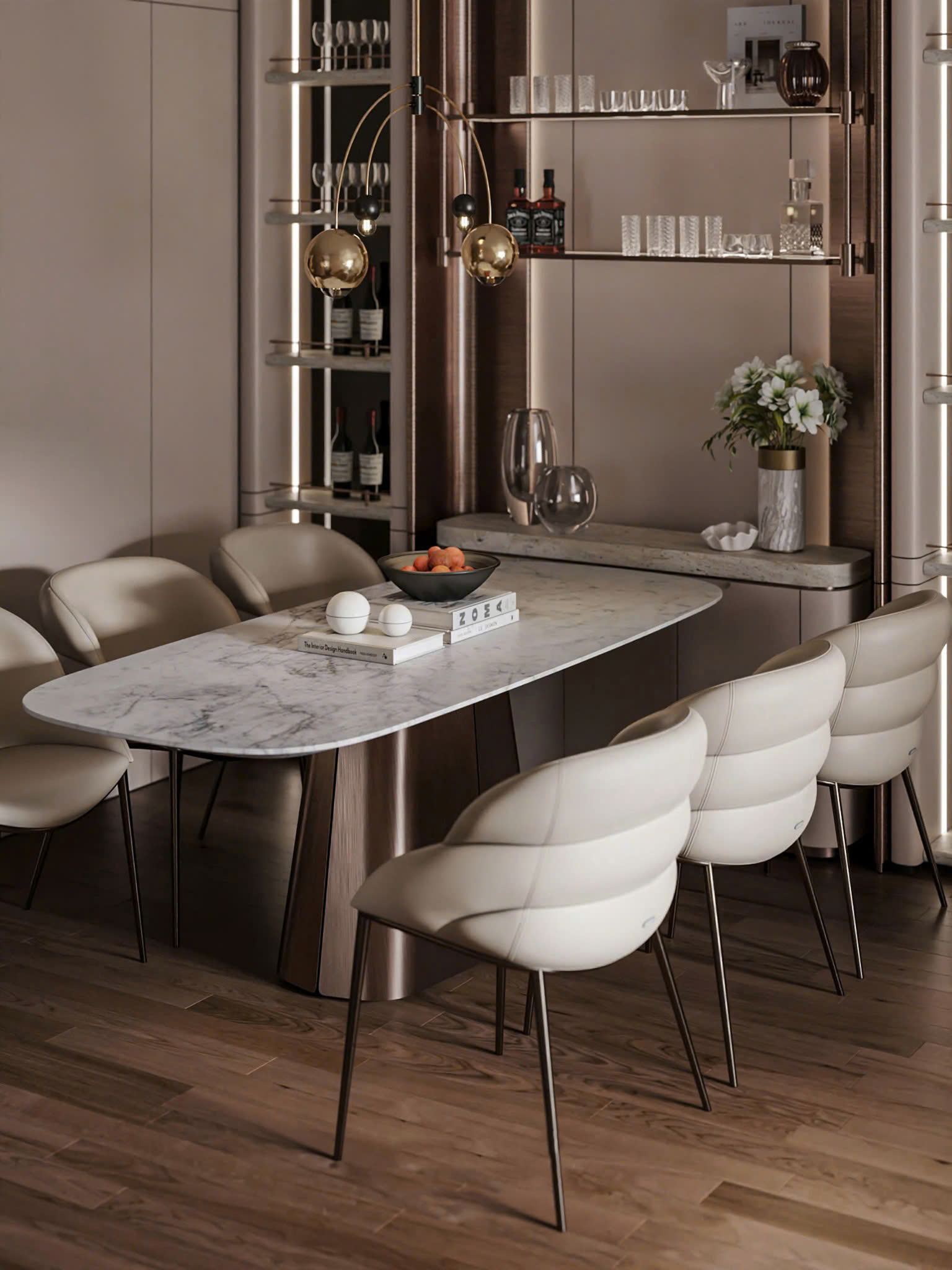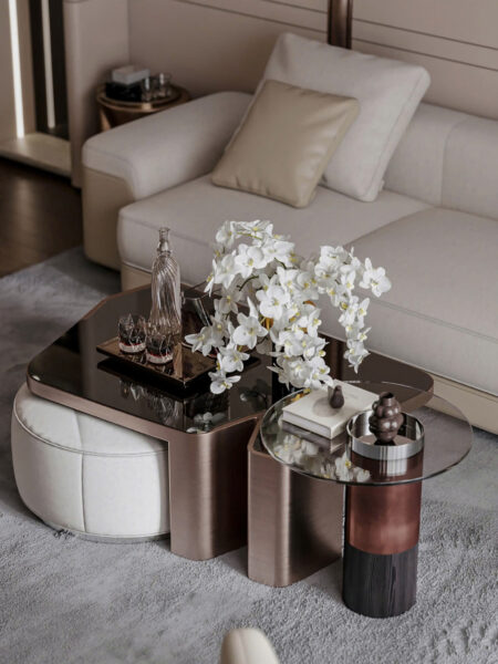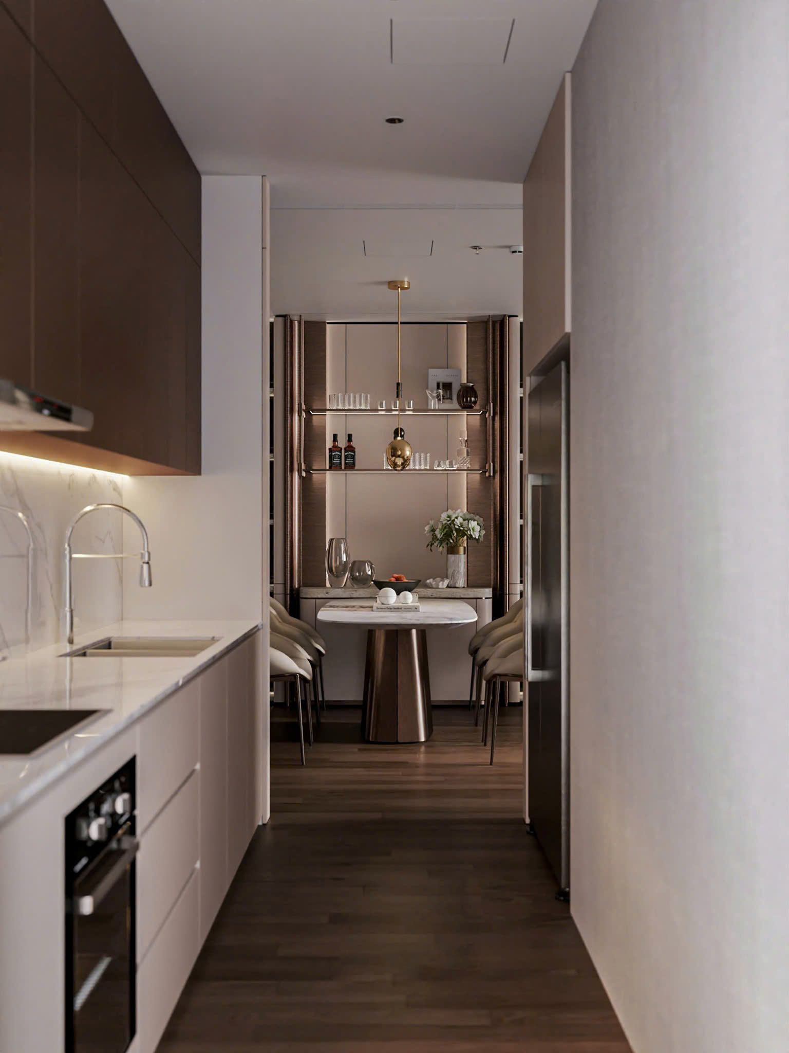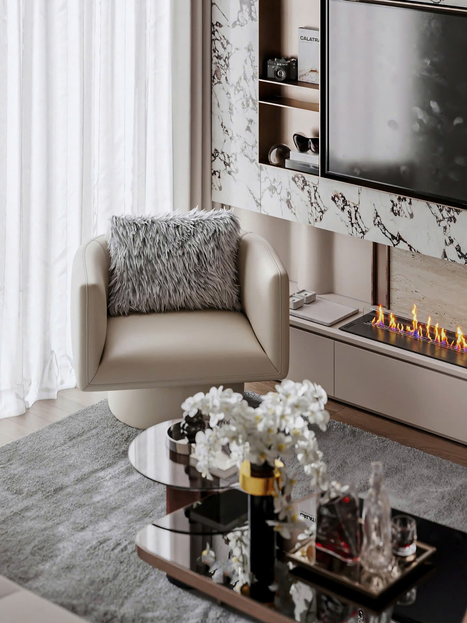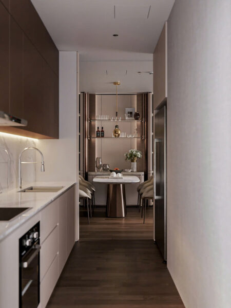 Phong cách thiết kế: Hiện đại Luxury – tông màu trắng kem, be vàng, ánh đồng kết hợp chất liệu đá và kim loại mạ vàng, mang lại sự sang trọng và ấm cúng