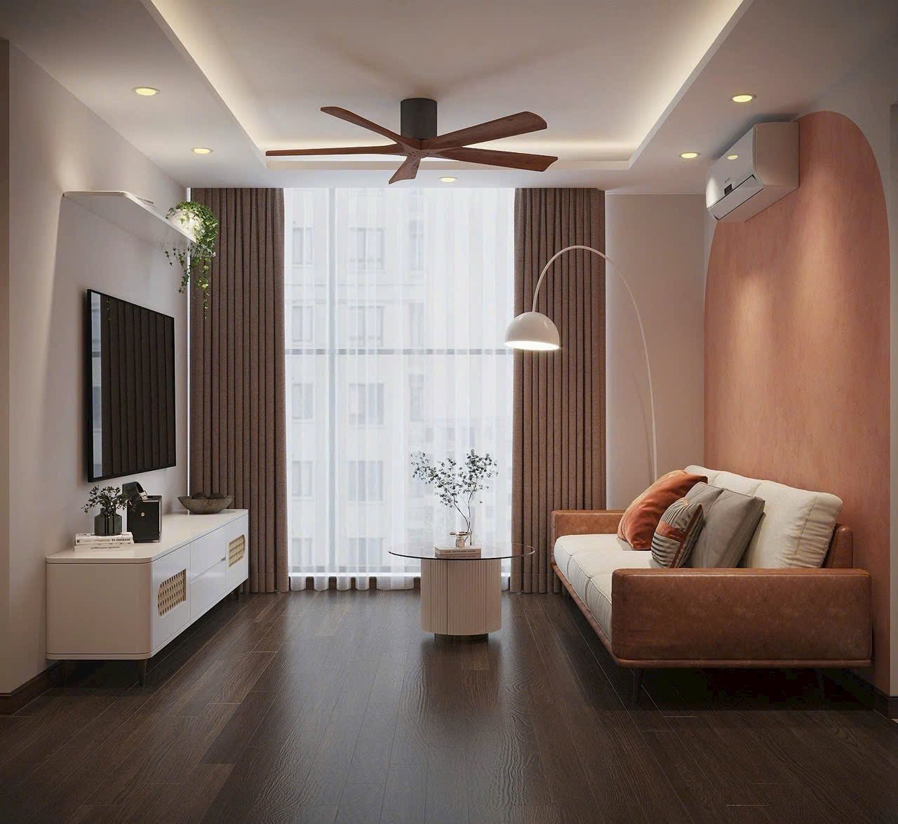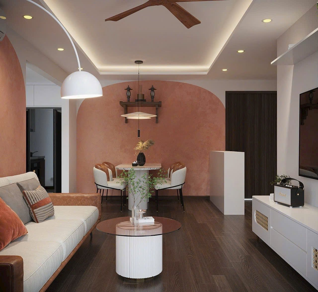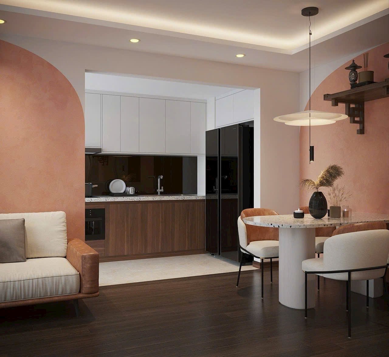 🌟 Sự giao thoa giữa Hiện đại & Nghệ thuật: Thay vì những mảng tường trắng đơn điệu, chúng tôi sử dụng sắc Cam Đất (Terracotta) kết hợp cùng đường cong vòm mềm mại. Đây không chỉ là màu sắc, mà là cảm xúc — mang đến nguồn năng lượng ấm cúng và sự thịnh vượng cho gia chủ.