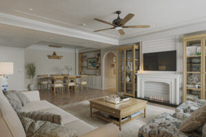 Phòng khách với đầy đủ nội thất như: ghế sofa, bàn trà, thảm, kệ tivi,...